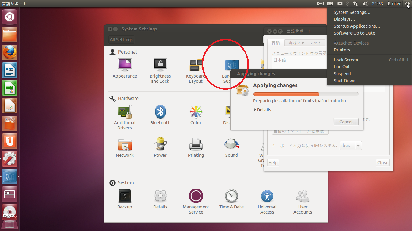 windowsユーザーだったが linuxのOS ubuntu が気に入りだした。 まず日本語化 ubuntu を最初に立ち上げると 当たり前だが 日本語ではない。こんな感じで シャットダウンを探すのも一苦労した。 こまずはここを日本語化しなければ日本語化するのは 超簡単だった。右上の system setting をクリックすると 又選択だが新しいBOXがでる。ここで LANGAGE SET UPをクリックしよう 赤丸のとこ これだけで日本語化になる。5分くらい待ったかな。 こうなった