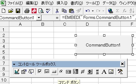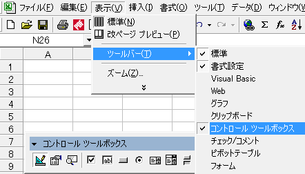 excel2000でVBA EXCEL 2000 でVBAを打ち込もうオとしたら コマンドボタン の在り処がわからなくなってしまった。 フォームの場所も忘れた!! なんのことはない。そういえばこんなとこにあった。「表示」 → 「ツールバー」 → 「コントロールボックス」